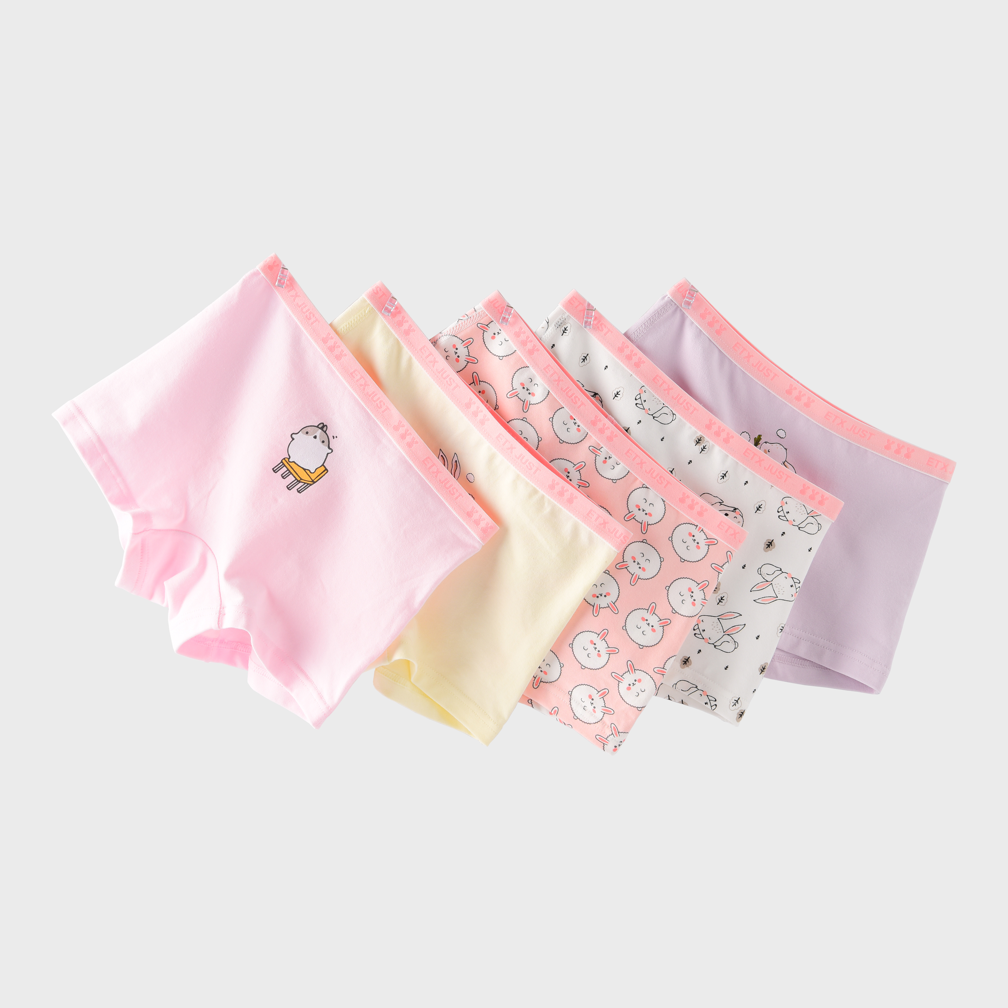 The design elements are thoughtfully curated to appeal to the vibrant spirit of childhood. Soft pastel shades of white, purple, yellow, and blush pink form the base, creating a visually appealing palette that young girls will adore. Adorning the front is a whimsical illustration of a girl, evoking fun and creativity, while the contrasting waistband adds a modern twist. Emblazoned with the “ETX JUST” logo and a subtle heart pattern, the waistband not only enhances the aesthetic but also ensures practicality for active lifestyles. These details make the girls' underwear stand out as more than just basics—they're little pieces of joy that encourage self-expression through fashion.